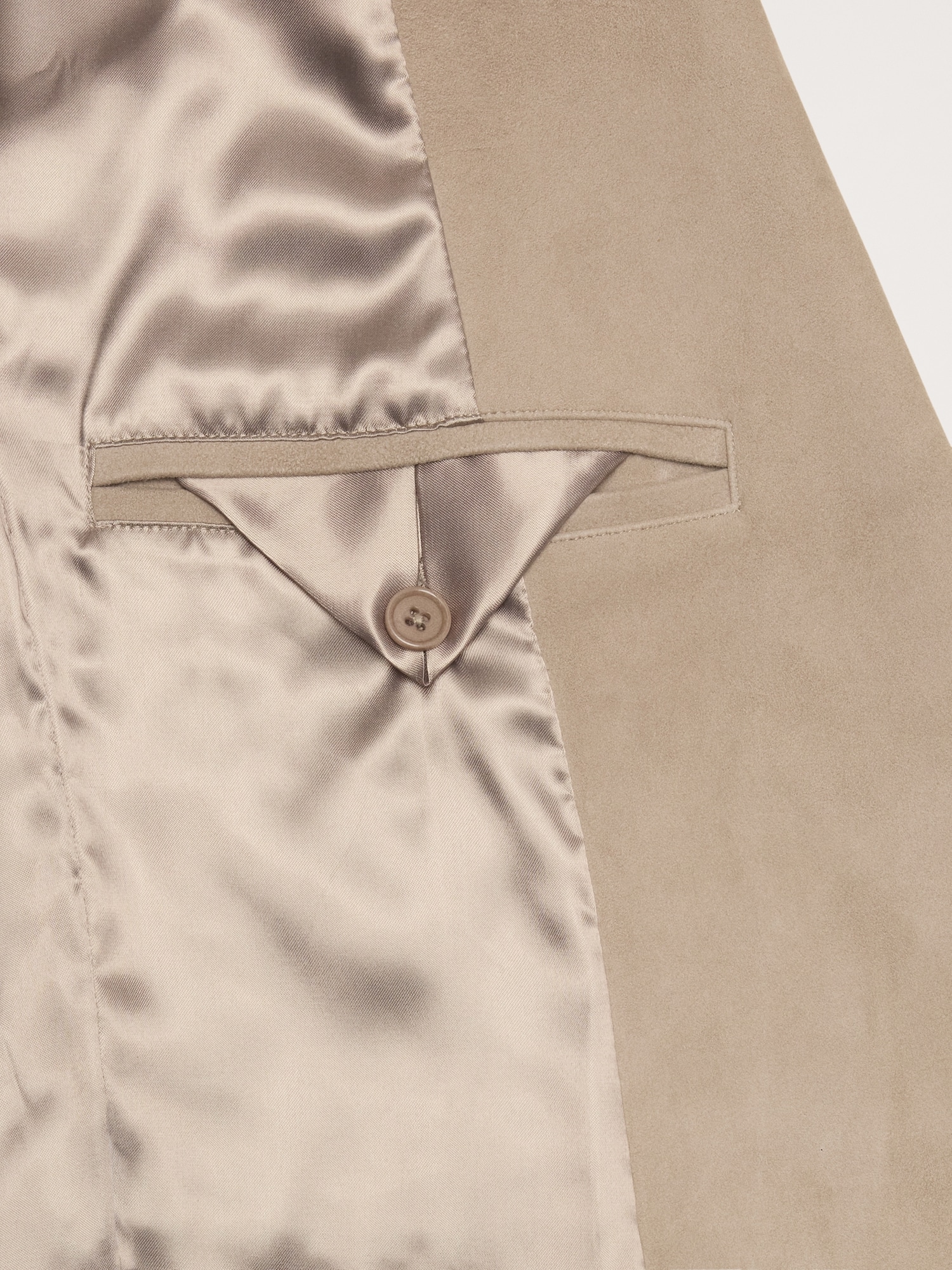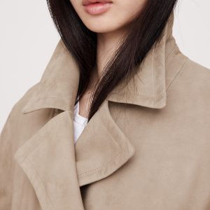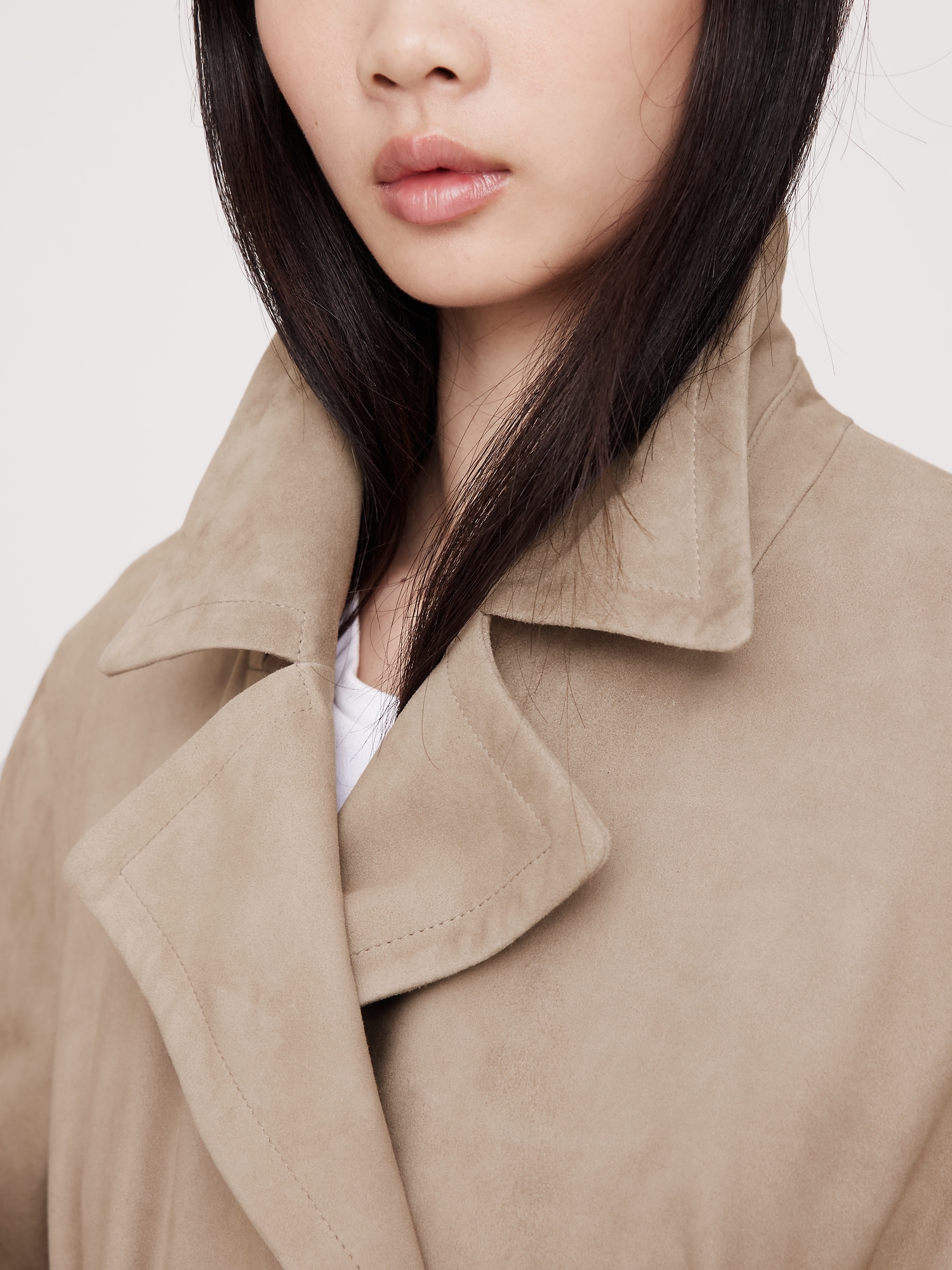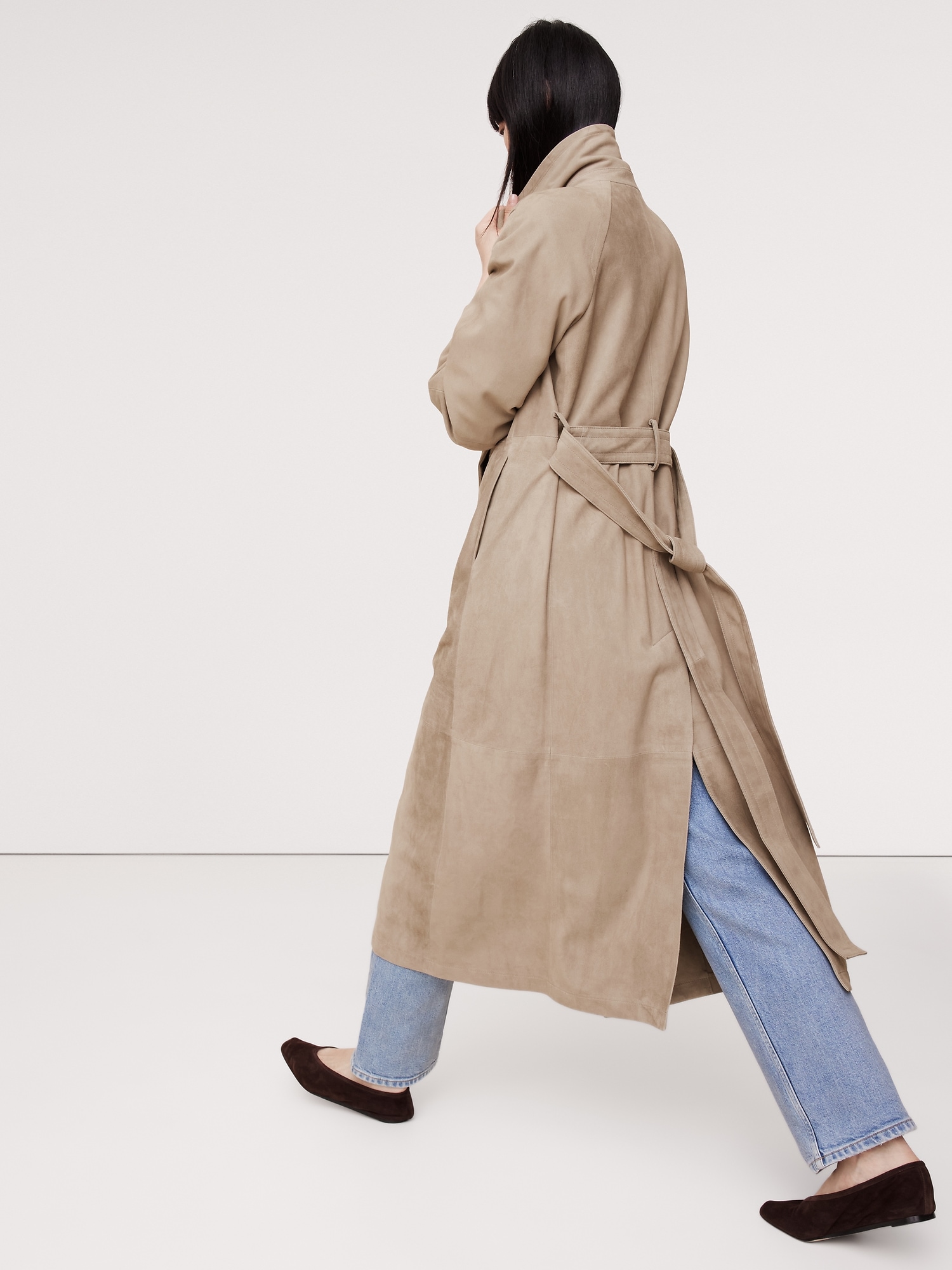 We reimagined the timeless trench coat, preserving the utilitarian vibe of the original with wide lapels, a belted waist, and shoulder epaulettes—crafted in premium suede in one of the world’s most renowned ateliers. Since it’s suede, it will only get better with time, developing a rich and unique patina.