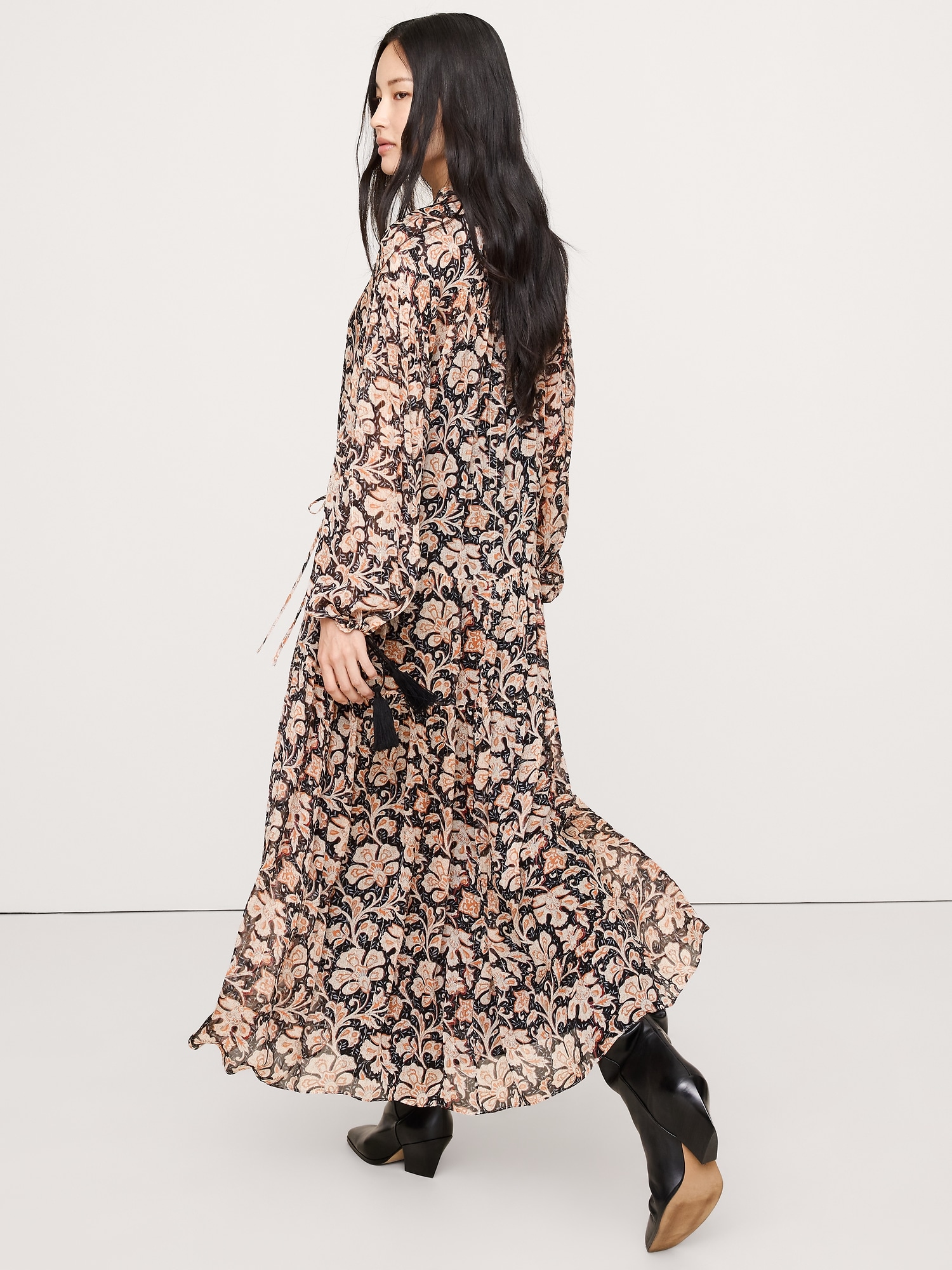 Look closely: this tiered maxi dress is cut from lighter-than-air chiffon with subtle, metallic lurex stripes. Plus, we added a camisole slip lining and tassels at the collar and cuffs. Shift fit: Relaxed shoulders, straight through bust, waist and hip with a straight skirt. Banded collar with tassel tie closure. Camisole slip lining. #818164