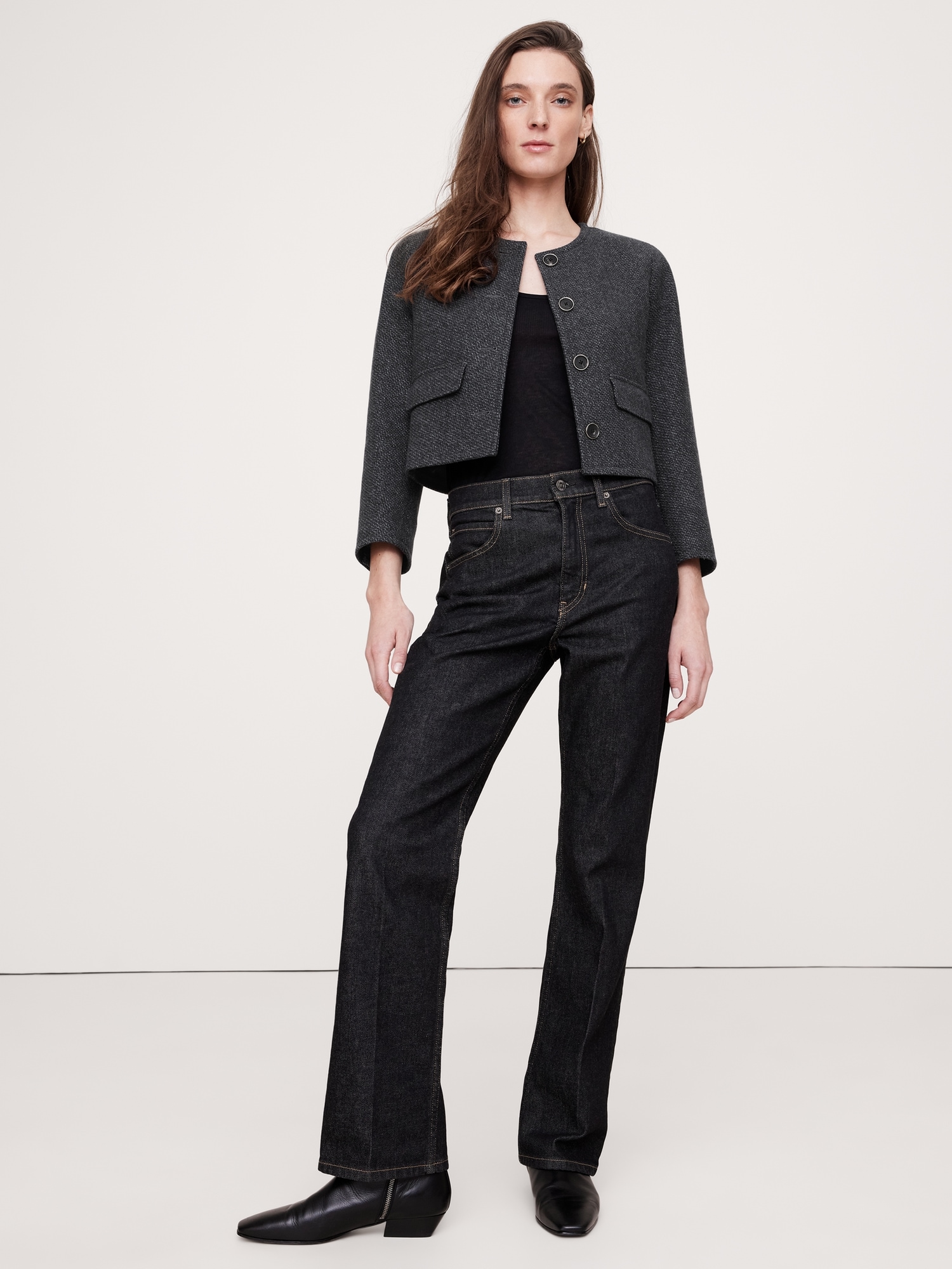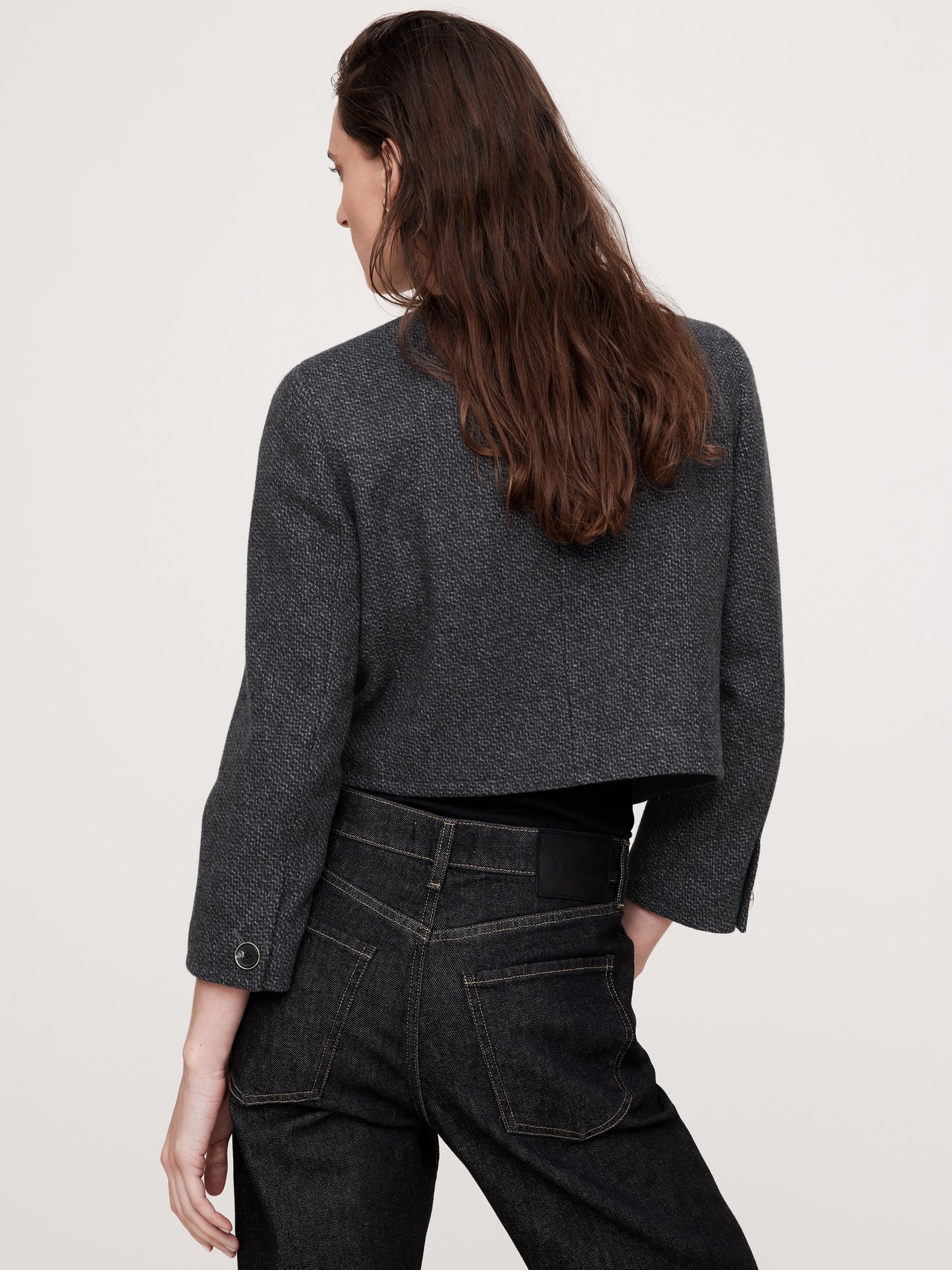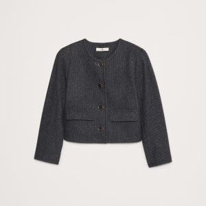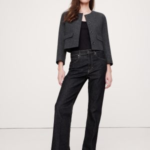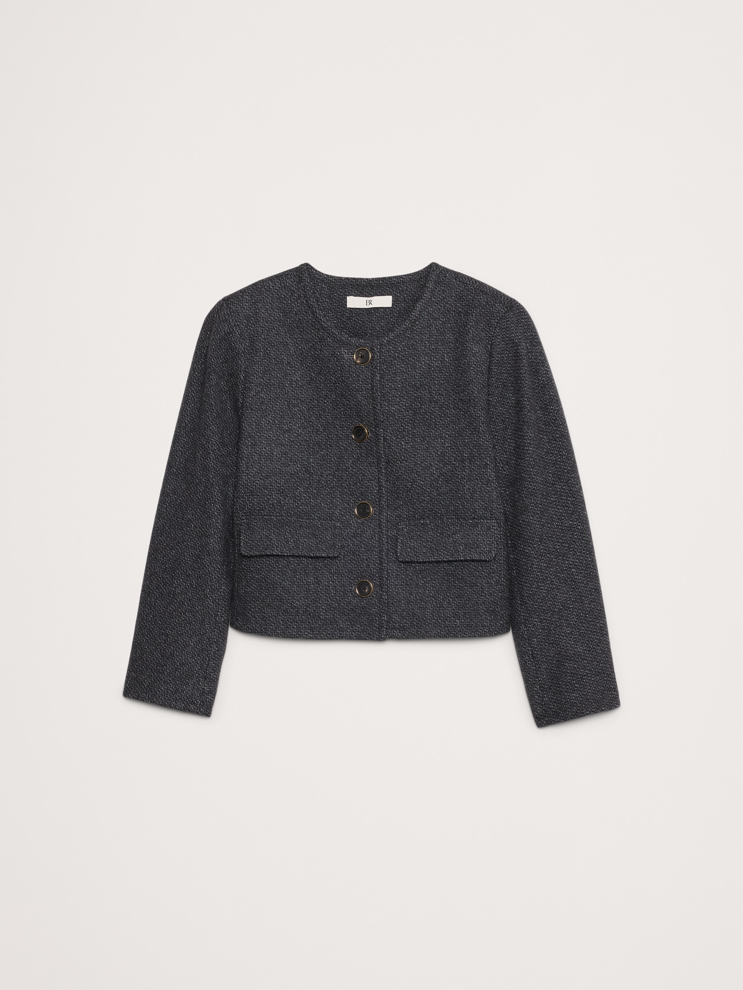 A little tailored, a little at-ease, this collarless lady jacket manages to be sophisticated, yet never stuffy thanks to a cropped length, bracelet-length sleeves, and a beautiful, wool-blend tweed in a midnight navy hue.